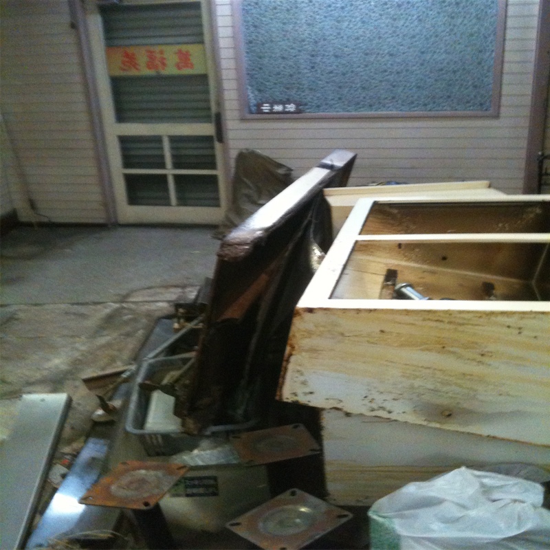 本日、シンクと接してるカウンターを外しました。上だけ外してもらおうとしたけど、古すぎて木自体が腐っていて全部外す事になった。