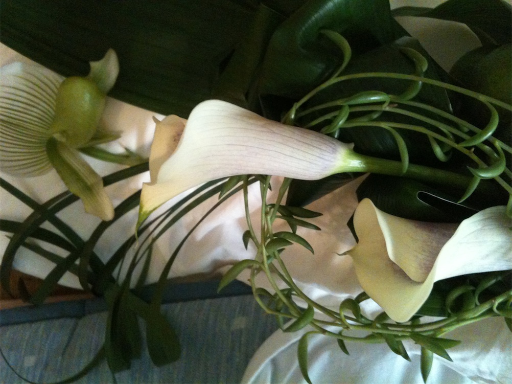 この写真では見えませんが、包装紙を使わず、大きな植物の葉を使い包装した作品です。